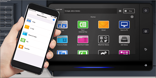 智能手机(iOS和AndroidTM)可用作便携式UI面板。只需在智能手机上设置作业,然后轻触多功能一体机的NFC(近场通信)区域,即可执行复印、扫描和传真(存储到文件夹或电子邮件)等基本操作。 |